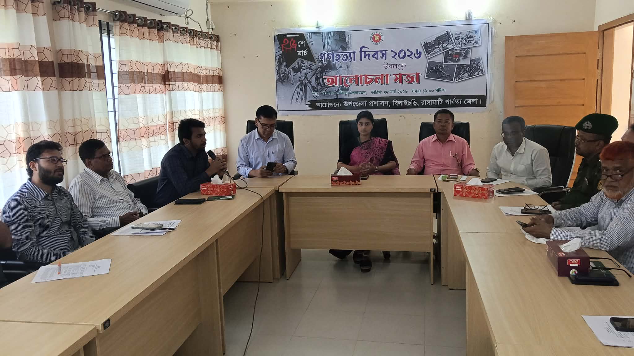 রাঙ্গামাটির বিলাইছড়ি উপজেলার গণহত্যা দিবস পালন করা হয়েছে। বুধবার (২৫ মার্চ) সকালে উপজেলা প্রশাসনের আয়োজনে কনফারেন্স রুমে  দিবসটি উপলক্ষে এক আলোচনা সভা অনুষ্ঠিত হয়েছে। সভায় উপজেলা নির্বাহী অফিসার হাসনাত জাহান খান এঁর সভাপতিত্বে অন্যান্যদের মধ্যে উপস্থিত থেকে বক্তব্য রাখেন উপজেলা বিএনপির সভাপতি এম এ সালাম ফকির, উপজেলা স্বাস্থ্য ও পরিবার পরিকল্পনা কর্মকর্তা ডাঃ সুরজিত দত্ত, ইউনিয়ন পরিষদ চেয়ারম্যান সুনীল কান্তি দেওয়ান, উপজেলা প্রাণী সম্পদ কর্মকর্তা ডা. মোহাম্মদ গোলাম আজম।